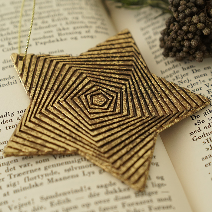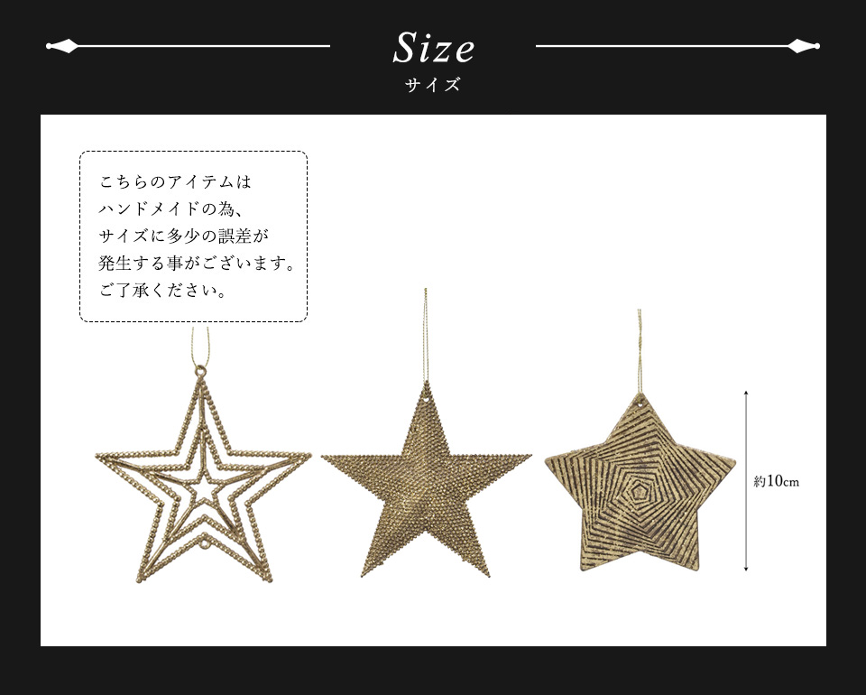 | ★シンプルな星型オーナメントです。 長い年月を経たようなアンティーク調の装飾がとてもお洒落です。 オーナメント全面に細かなドットが施されており、シンプルな中にもこだわりが感じられるアイテムです。流行に左右されない安定感のあるデザインも魅力のひとつです。 煌びやかすぎない少しくすんだゴールドの色合いでツリーに落ち着きのある大人の雰囲気をプラスしてくれます。 ツリーに飾るのはもちろん、玄関先やリビングのインテリアとしてもお使いいただけます。壁飾りにもおすすめです。 主張しすぎない程よい存在感があり、コーディネートしやすいオーナメントです。 サイズは高さが約10cmです。 |