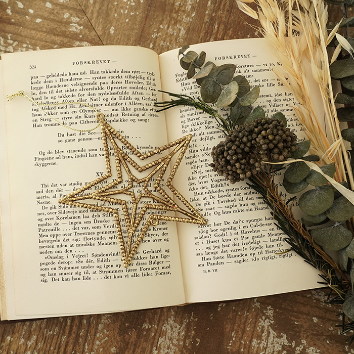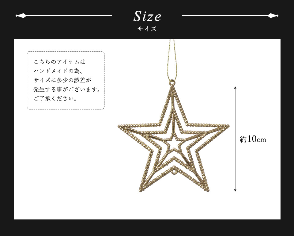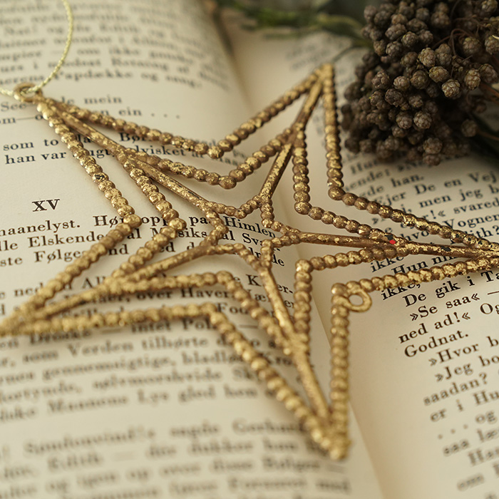 ★シンプルな星型オーナメントです。 長い年月を経たようなアンティーク調の装飾がとてもお洒落です。 大きさの異なる3つの星が象られた透かし模様にはシンプルな中にもこだわりが感じられます。流行に左右されない安定感のあるデザインも魅力のひとつです。 煌びやかすぎない少しくすんだゴールドの色合いでツリーに落ち着きのある大人の雰囲気をプラスしてくれます。 ツリーに飾るのはもちろん、玄関先やリビングのインテリアとしてもお使いいただけます。壁飾りにもおすすめです。 主張しすぎない程よい存在感があり、コーディネートしやすいオーナメントです。 サイズは高さが約10cmです。 |