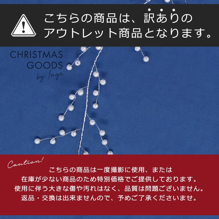 ★【こちらは訳ありのアウトレット商品です。】 欧州メーカーの出荷前検査をクリアし「規格品」として出荷された商品に対して弊社で国内検品を行い、色ムラや傷、塗装や装飾の乱れを確認した商品です。 欧州メーカーの規格内商品であり、不良品ではございません。返品・交換は出来ませんので、予めご了承くださいませ。 小粒で優しい印象のイミテーションパールが装飾されたガーランドです。 長さのあるオーナメントは上品な華やかさでツリーをドレスアップさせ優雅な雰囲気を添えてくれるお洒落なアイテムです。 ツリーにもう少し華やかさをプラスしたい方や、あと一つ物足りなさを感じている方にぜひ取り入れていただきたいアイテムです。 枝部分にはワイヤーが使われているので自由にパールの方向を変えることができ、自分好みのデコレーションにアレンジしやすいです。 クリスマスツリーを大人の気品漂うエレガントな雰囲気や、清楚で落ち着きのある雰囲気に仕上げたい方におすすめです。 クリスマスツリーのオーナメントとして飾るだけでなく、玄関やシェルフの上に置いてディスプレイしたり窓際や壁から吊したりするなど、お部屋のインテリアとしてもお使いいただけます。 サイズは長さが約40cm、パール一粒あたり約8mmです。 ※製品の特性上、長さに若干の誤差(約2~3cm前後)が生じる場合がございます。 |