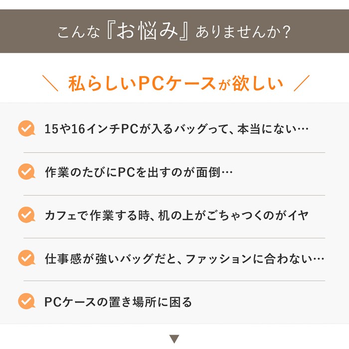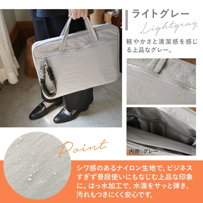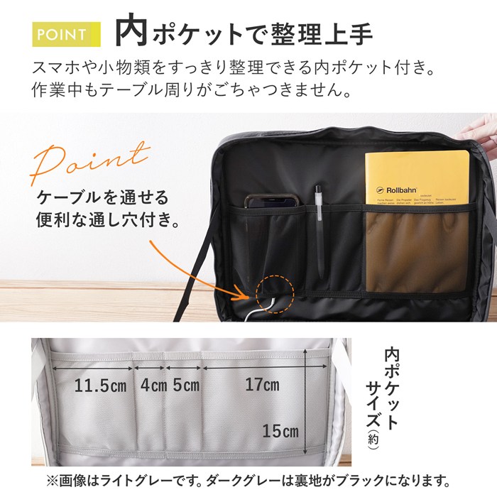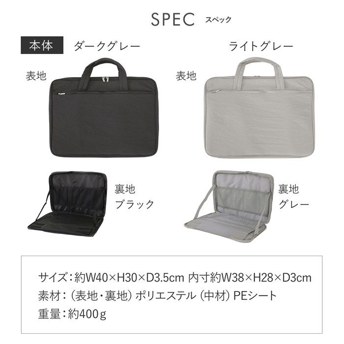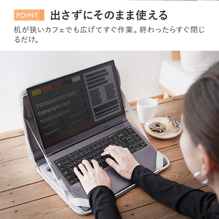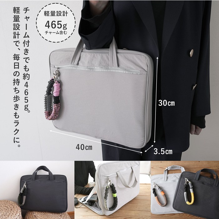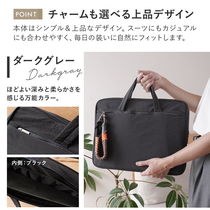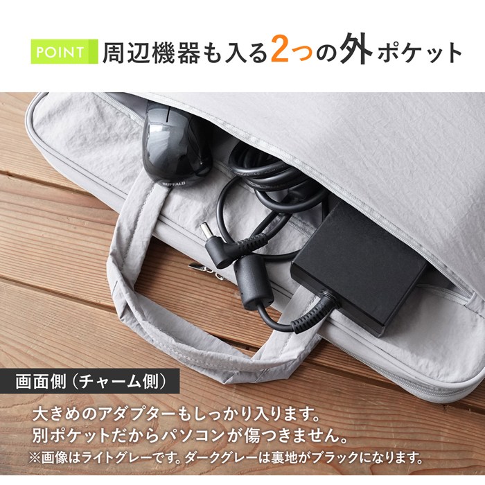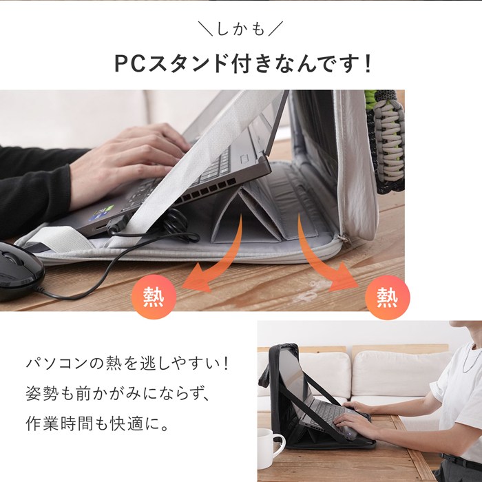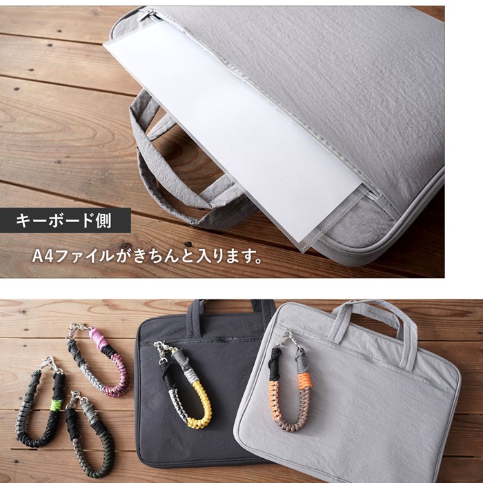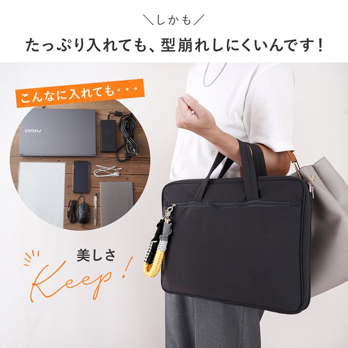 | 15.6~16inPC対応 動画編集やクリエイティブ作業に欠かせない、15.6~16インチの大きめPCに対応。クッション生地でパソコンを守ります 出さずにそのまま 机が狭いカフェでも広げてすぐ作業。終わったらすぐ閉じるだけ。 \しかも/PCスタンド付きなんです! パソコンの熱を逃しやすい!姿勢も前かがみにならず、作業時間も快適に。 内ポケットで整理上手 スマホや小物類をすっきり整理できる内ポケット付き。作業中もテーブル周りがごちゃつきません。スマホのケーブルを通せる便利な通し穴付き。 周辺機器も入る2つの外ポケット 画面側(チャーム側) 大きめのアダプターもしっかり入ります。 別ポケットだからパソコンが傷つきません。 キーボード側 A4ファイルがきちんと入ります。 \しかも/たっぷり入れても、型崩れしにくいんです! チャームも選べる上品デザイン 本体はシンプル&上品なデザイン。スーツにもカジュアルにも合わせやすく、毎日の装いに自然にフィットします。 よくある質問 Q. 何インチのPCが入りますか? A. 15~16インチのPCに対応しています。 内寸は約W38×H28×D3cmです。弊社で検証したところ、W38×H25×D2.8cmの厚みのある大きめノートパソコンも収納できました。 |