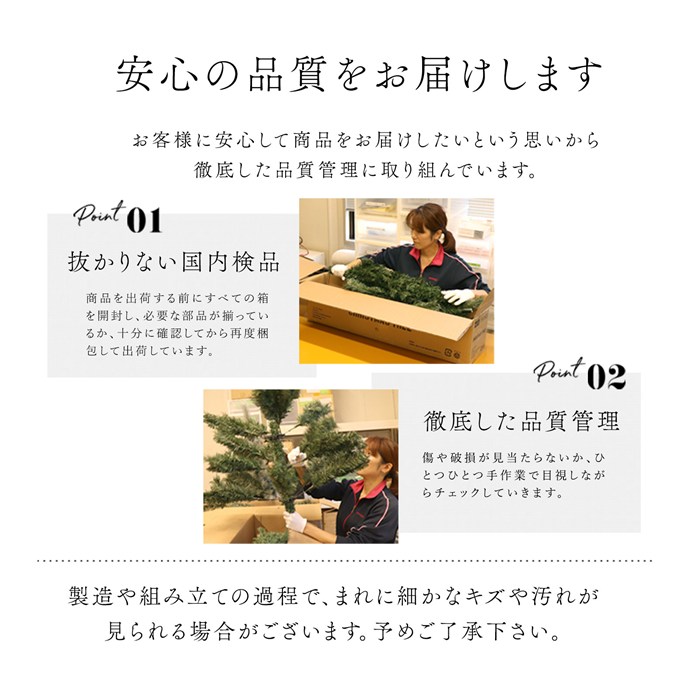 | お客様に安心して商品をお届けしたいという思いから徹底した品質管理に取り組んでいます。 「抜かりない国内検品」 商品を出荷する前にすべての箱を開封し、必要な部品がそろっているか十分に確認してから再度梱包して出荷しています。 「徹底した品質管理」 枝や幹、枝葉の部分など、キズや破損が見当たらないかひとつひとつ手作業で目視しながらチェックしていきます。 |