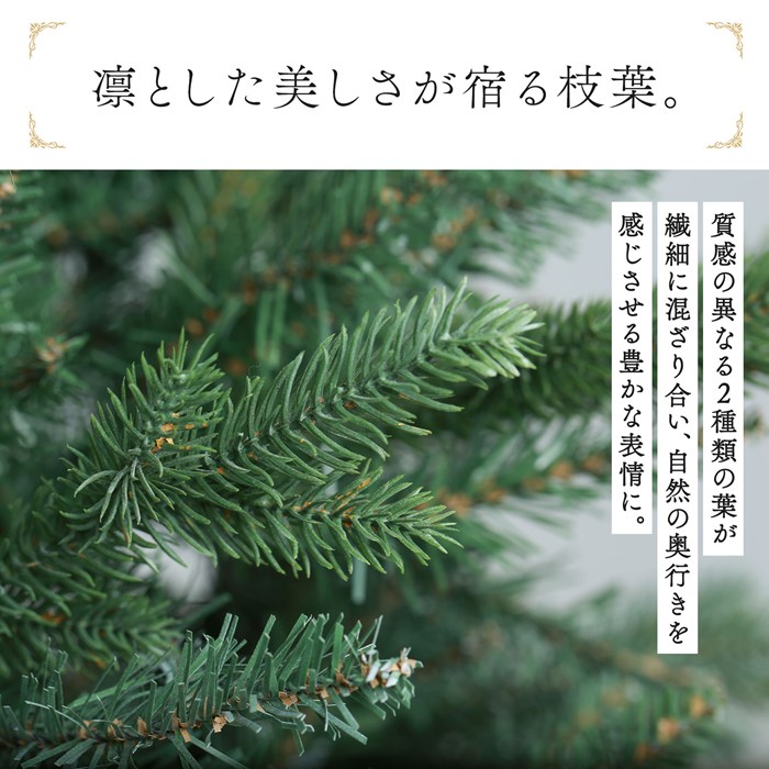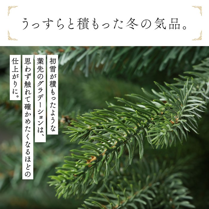 | 【優雅に満ちる、冬の華やぎ】 ドイツの冬景色を思わせる幻想的なフロストツリー。微かに雪をまとったような静かな美しさと、生木さながらの豊かなボリュームが、空間に本物の気配と静かな華やぎをもたらします。 【凛とした美しさが宿る枝葉】 質感の異なる2種類の葉が 繊細に混ざり合い、自然の奥行きを 感じさせる豊かな表情に。 |