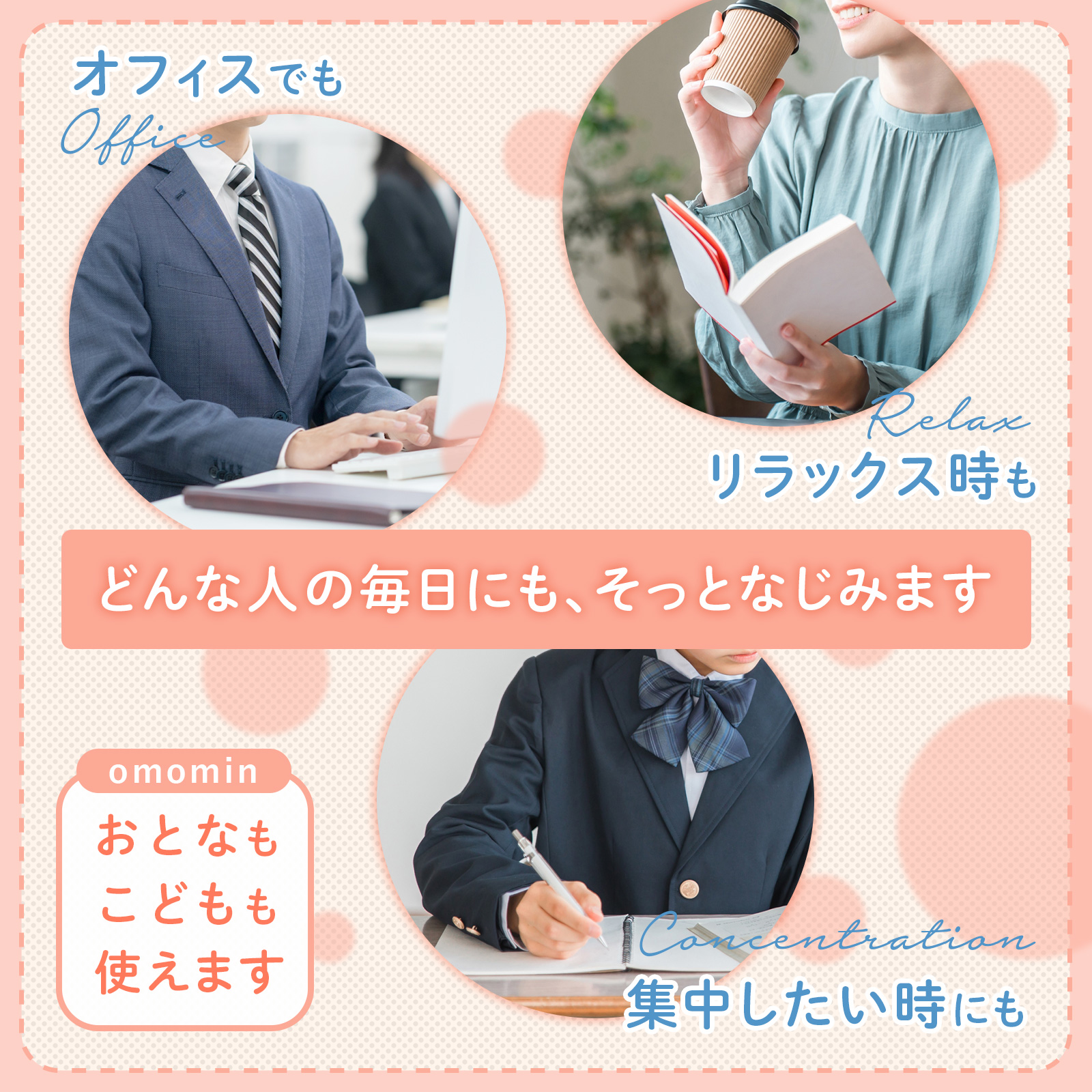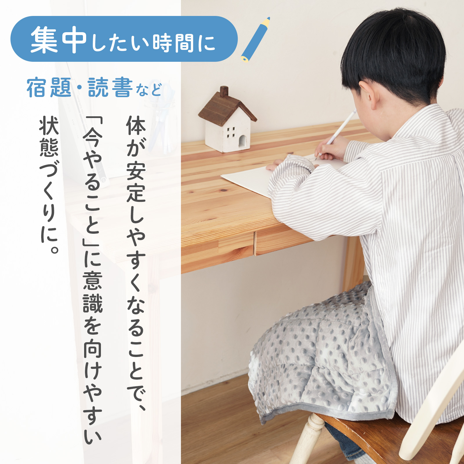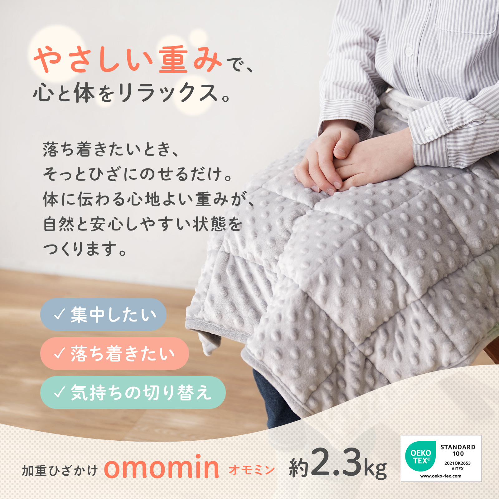 ●集中しやすい環境づくり 適度な重みが体にやさしくかかることで、そわそわしやすい、じっとできない、切り替えが苦手、緊張しやすいといった場面でも、体の安定を感じやすくなり、気持ちを整えるきっかけになります。体が安定することで、集中しやすい環境づくりにもつながります。 ●安心しやすい状態づくり 加重ひざ掛けは「ウェイトブランケット」とも呼ばれ、家庭でできる支援アイテムとして注目されています。 発達障害(神経発達症)・ADHD(注意欠如・多動)・ASD(自閉スペクトラム症)・発達特性・グレーゾーンなど、落ち着きにくさや感覚の過敏さを感じやすいお子さまにも配慮し、「安心しやすい状態づくり」をサポートすることを目的としています。 ●毎日にそっと馴染む 宿題・勉強・読書・タブレット学習などの学習時間はもちろん、おうち時間やリラックスタイム、病院の待ち時間や映画館、移動中など、さまざまなシーンでご使用いただけます。子どもだけでなく大人の方にもお使いいただけ、オフィスや在宅ワークなど、落ち着いて過ごしたい時間にも取り入れやすく、どんな方の毎日にもそっと馴染むひざ掛けです。 ●選べる2タイプ オールシーズン使える通年タイプと、ひんやり感じるバンブーファイバー素材のクールタイプをご用意。 ●安心して使える素材 有害物質検査済みのOEKO-TEXR Standard 100認証素材を使用。毎日使うものだから、素材にも配慮しました。 ●整いやすい「環境」をつくる 「落ち着きたい」「集中したい」「不安をやわらげたい」そんなお子さまの気持ちに寄り添い、家庭でできる支援をさりげなく取り入れられる、加重ひざかけ omomin(オモミン)です。 |