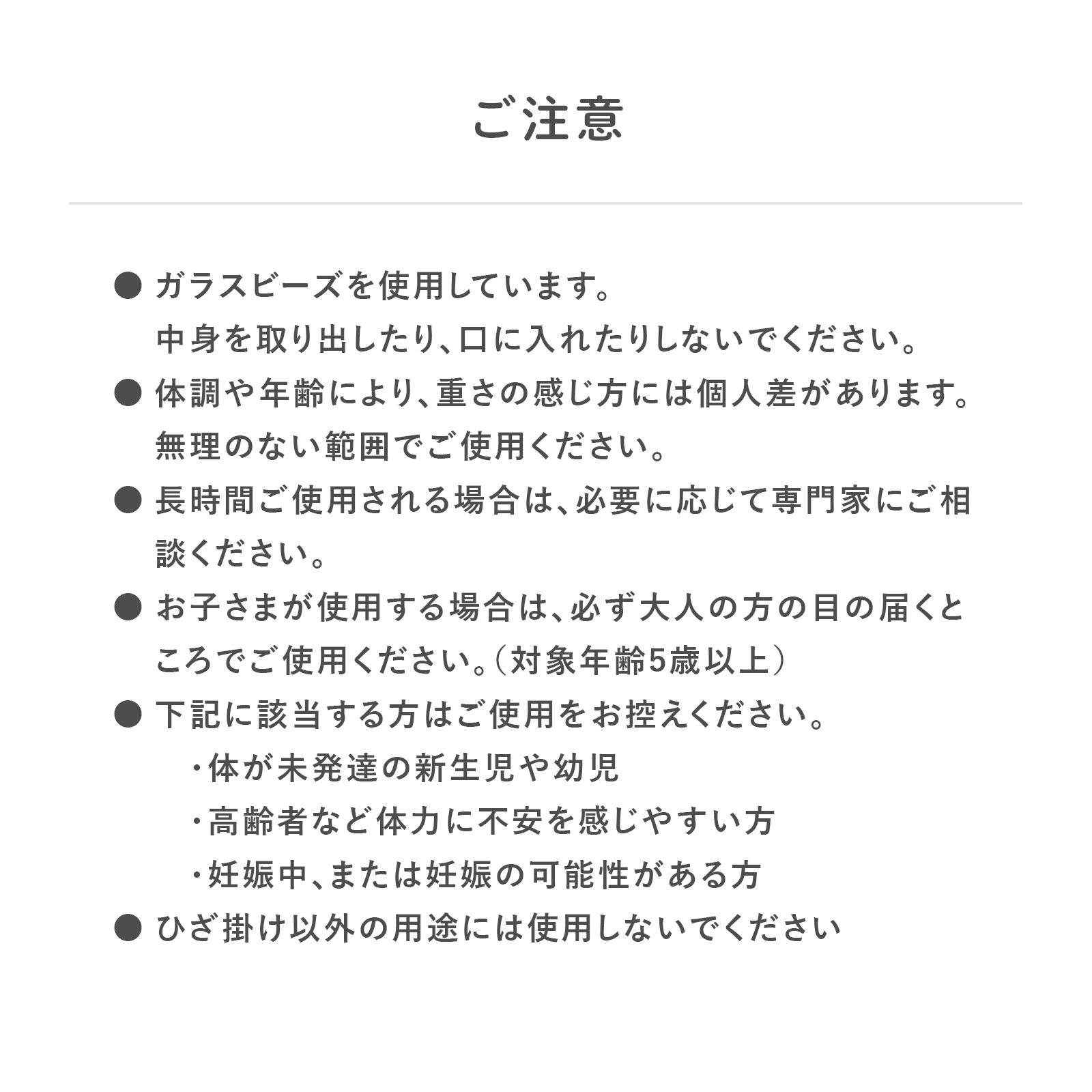 ・ガラスビーズを使用しています。中身を取り出したり、口に入れたりしないでください。 ・体調や年齢により、重さの感じ方には個人差があります。無理のない範囲でご使用ください。 ・長時間ご使用される場合は、必要に応じて専門家にご相談ください。 ・お子さまが使用する場合は、必ず大人の方の目の届くところでご使用ください。(対象年齢5歳以上) 下記に該当する方はご使用をお控えください。 ・体が未発達の新生児や幼児 ・高齢者など体力に不安を感じやすい方 ・妊娠中、または妊娠の可能性がある方 ・ひざ掛け以外の用途には使用しないでください。 |