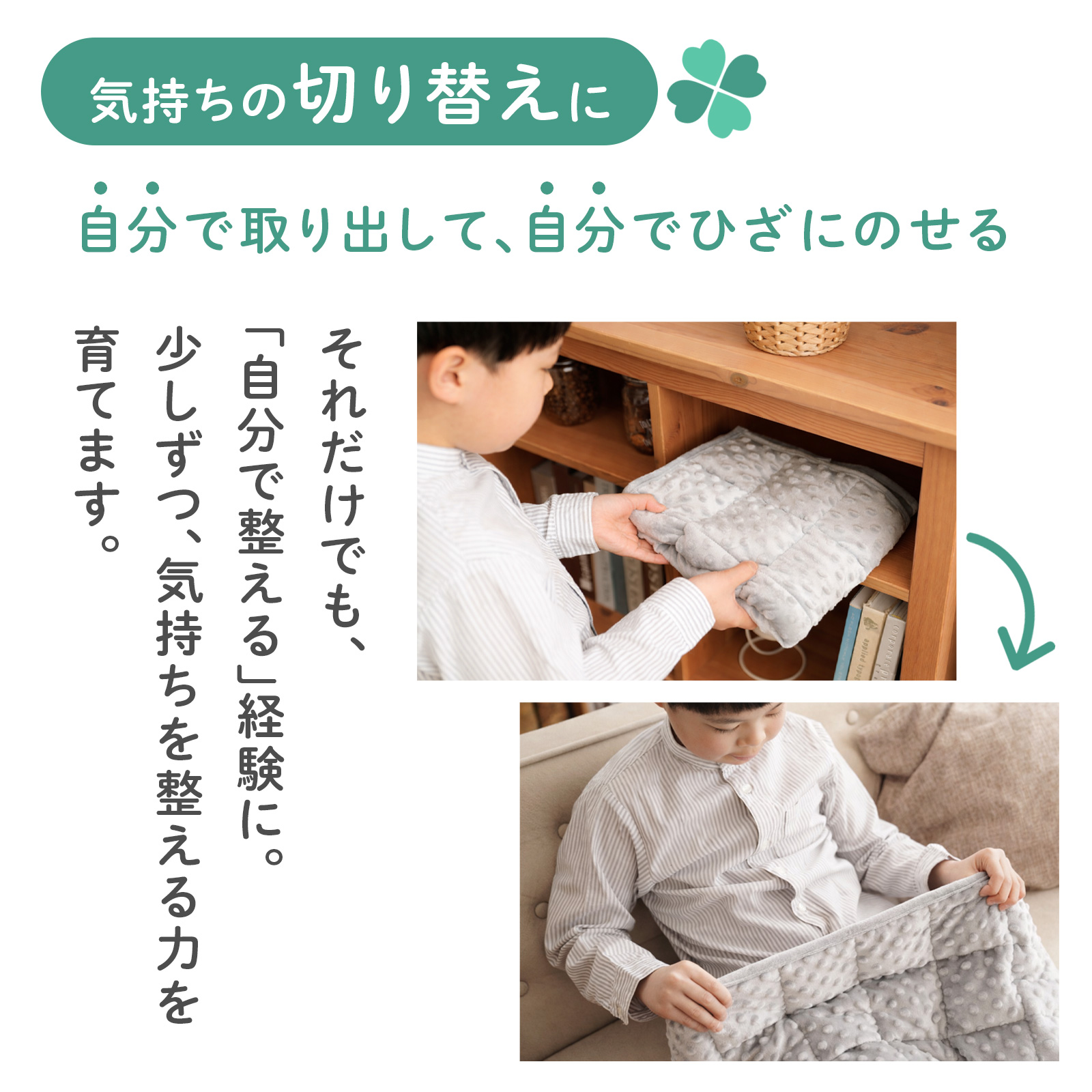 落ち着きたいとき、そっとひざにのせるだけ。 体に伝わる心地よい重みが、自然と安心しやすい状態をつくります。 |